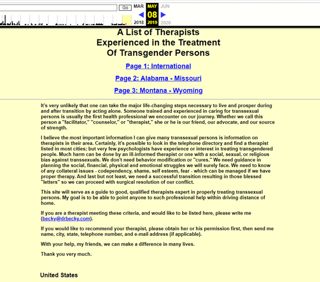 In researching a therapist who is transitioning children, I came across a page that a “doctor” had hosted as a resource for people seeking transition. The website was taken down and all that remains is an archived version seen in the screen shot below.
