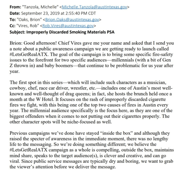 The City of Austin seems to be in deep with drag queens. In fact, the Austin Fire Department did a public service announcement about fire safety featuring a drag queen. Jimmy Flannigan’s office was involved in making suggestions for the script of that PSA. The first in a chain of emails is sent from the Austin Fire Department’s media spokesperson to Brion Oaks, who is the Chief Equity Officer for City of Austin. Brion Oaks brings value to the taxpayers by making suggestions of how to make the city less “racist” and “offensive” including renaming streets, buildings and monuments so nobody will be “offended”. The Austin Fire Department’s Fire Marshall was also copied on the email.