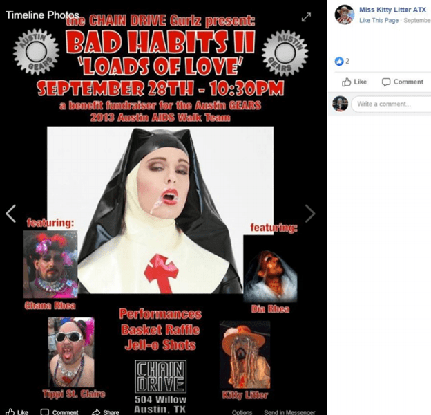 MassResistance released this expose on the drag queen in August of 2019 when residents of Austin joined MassResistance Texas State Director in a press conference calling for an end of the drag queen story time child grooming hour. Included in the expose were the disgusting and perverse images from Miss Kitty Litter’s social media, the porn he was following publicly on his social media page, and his mockery of the Virgin Mary and the Christian faith. Austin “prides” itself on being diverse, but does diversity and inclusion include Christians? If this drag queen had mocked Islam would the drag queen still be invited to do drag programs by the city?