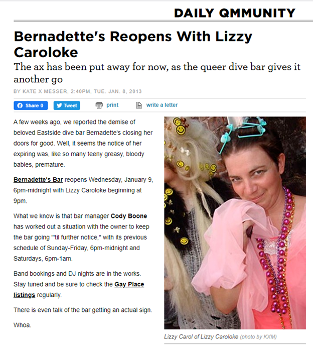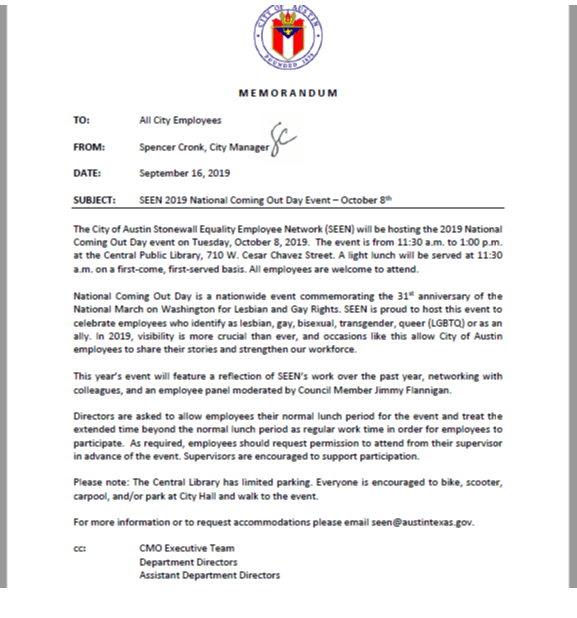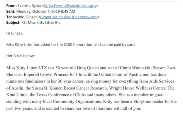 It appears that Miss Kitty Litter was paid $100 honorarium to share his love of literature with employees of the City of Austin, most likely for the drag queen story time performance planned for the October 8th Coming Out Day lunch which Austin has been hosting annually. Ginger Jacinic, who was included in the email chain, is an openly lesbian employee of Austin Energy and her wife also works for the city. Sylba Everett, Chief Administrative Officer in Human Resources for the city was also included and appears to have contributed to the bio of Kitty Litter. Lizzy Carol, who is also know for her karaoke alter ego “Lizzy Caroloke” host of “Austin’s Queerest Karaoke Night” entertains at “queer dive bars” in Austin at night but during the day she is the Executive Assistant to openly homosexual councilman, Jimmy Flannigan, who infamously flamed out when drag queen story hour was opposed at a city council meeting last summer.