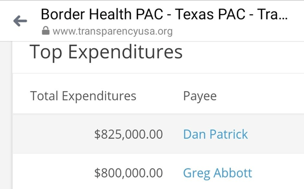 Border Health PAC is “tacitly” run by Alonzo Cantu, an influential Democrat political donor who according to this article has bought influence with Lt. Governor Dan Patrick once before. The following graphic is from the aforementioned Texas Monthly article and illustrates large contributions from the PAC to Texas politicians. Greg Abbott and Dan Patrick are among the top recipients of the PAC money since 2000.