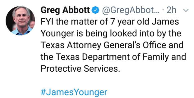 Attorney General Ken Paxton also was among the recipients taking in $200K in contributions from the PAC since 2015. It makes one wonder if there was any truth to the following Tweet from Greg Abbott in 2019 when James Younger’s story was going viral. James Younger is a 9 yr old boy at the center of a dispute between his parents. James’ mom has been declaring that her son is transgender and is really a girl since he was a toddler due to his selection of a girl themed Happy Meal toy from McDonald’s. Jeff Younger, the father, has been fighting to save his son from gender disfigurement and to save his son’s future fertility. When the case went viral Governor Abbott chimed in on social media, reportedly after a big donor contacted him to ask why he was not doing anything and told him it would cost him a donation. We don’t call him “Governor Fundraiser” for nothing!