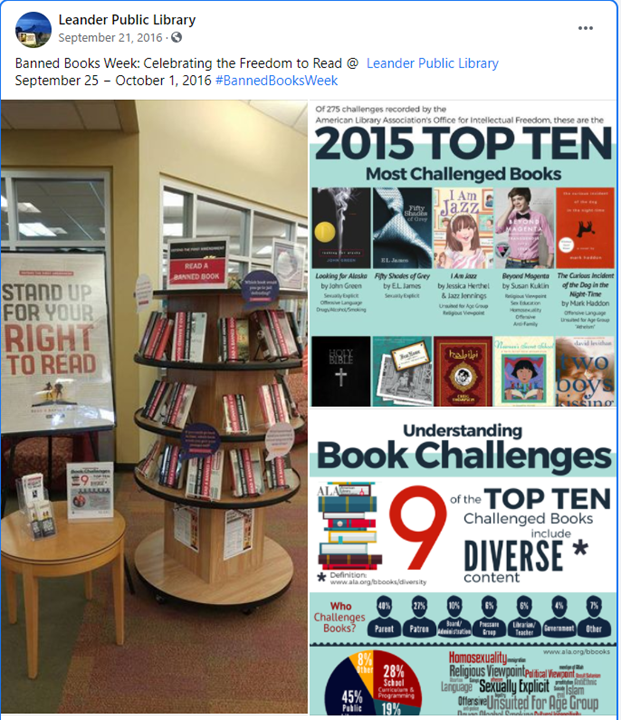 It remains to be seen what the new director of the Leander Library will roll out for Banned Books Week, if anything. The library has promoted Banned Books Week for several years on its social media page, but did not do so in 2020. In the past they promoted books such as “I Am Jazz” which promotes the unscientific and dishonest idea that a person can be born into the wrong body or have a male or female brain…an absolutely sexist and absurd notion. They also promoted “Beyond Magenta”, a young adult book that promotes transgenderism to youth and contains discussion of adult-child sexual relations without any mention of it being illegal, abusive or immoral.