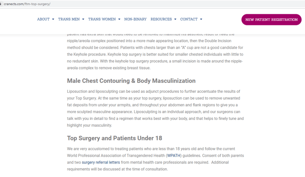 How busy are the gender surgeons in Texas? Dr. Mundinger is so busy doing “top surgeries” at the Crane Center in Austin TX that he is booked for three months in advance. Note that his website says he provides surgeries for minors. This collaborates with what MMB reported before on Crane Center in Austin TX.