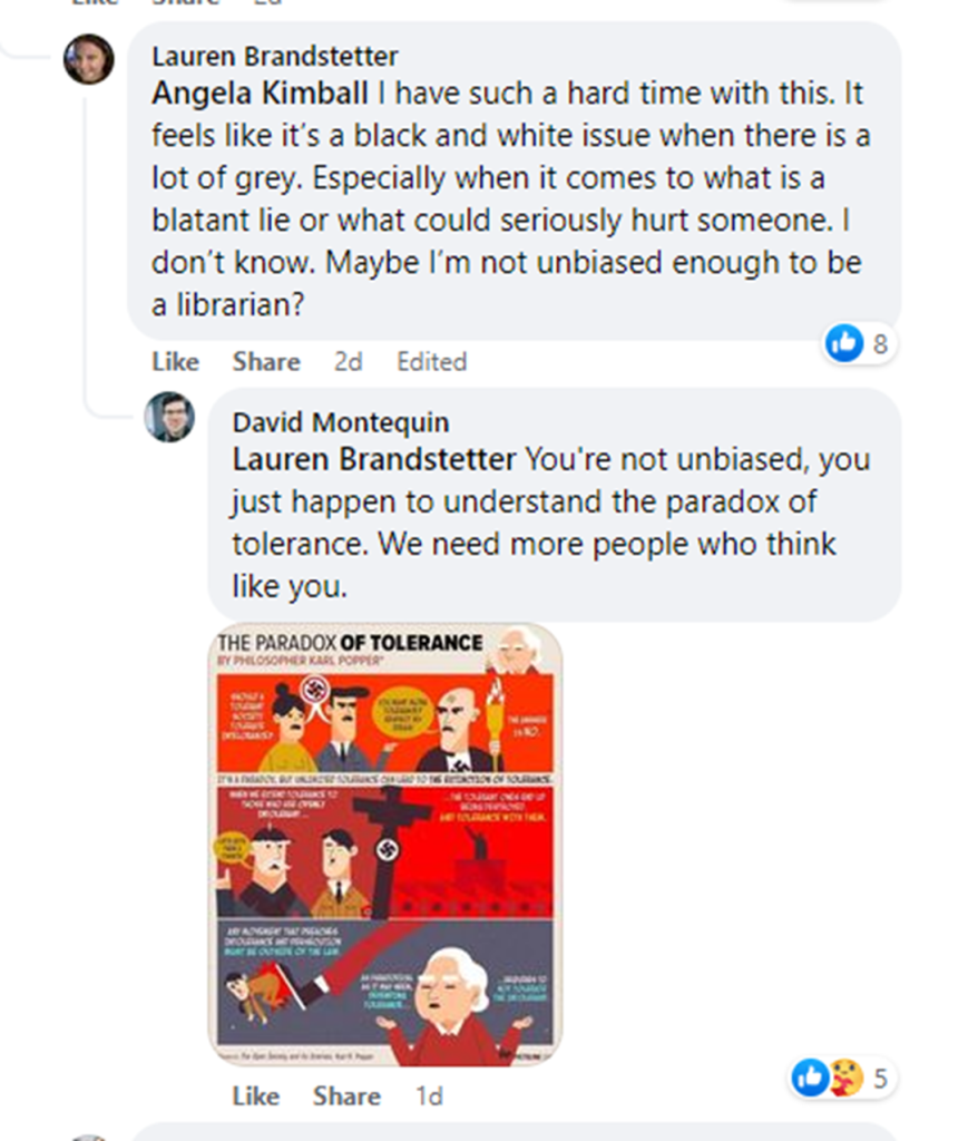 A few of the librarians commented on the Paradox of Tolerance. David Montequin, who works at a First United Methodist Church in Bedford, TX as a children’s ministry intern, but studied library science at Texas Women’s University, shared the meme often shared by Antifa supporters.