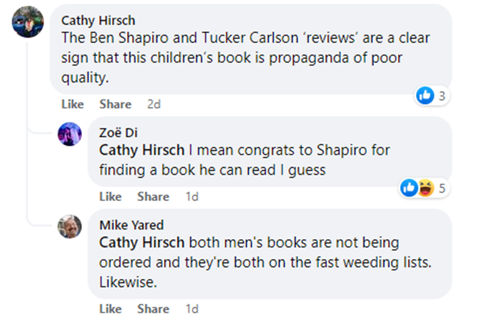 Media Specialist at Chamblee Middle School in Dekalb County School District, Chamblee, Georgia commented that “The Ben Shapiro and Tucker Carlson reviews “are a clear sign that this children’s book is propaganda of poor quality”. I guess, as opposed to the usual leftist and LGBTQ propaganda they support in the libraries? Another librarian in the thread, Mike Yared, admits the books by both men, presumably, Tucker Carlson and Ben Shapiro, are both on the “fast weeding list”. Wait! There’s a fast weeding list? I thought librarians were committed to diversity and inclusion and not censoring any views? Apparently, there are workarounds to the Library Bill of Rights.