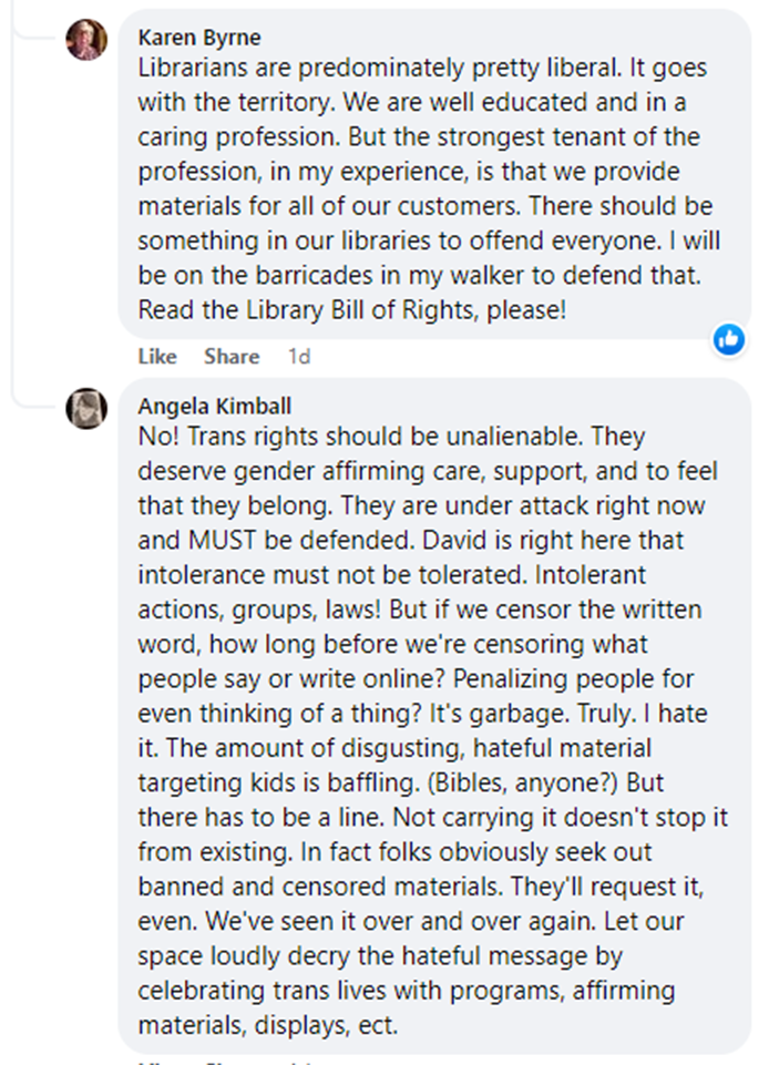 Apparently, Anna Wegner is not impressed with the reviews. In the comments section, she continues: “…if a book came out that let’s say instructed others on how to commit hate crimes and get away with it, and it was popular among the far right, would that still be the best thing for the community? I would be willing to take the claim of “discrimination” by a patron over my conscious. If someone wants a book this badly, specifically books that spout dangerous misinformation, they can buy it themselves”. This is exactly what concerned parents and citizens all over the USA are saying should be done with child sex grooming books and books that seek to brainwash kids with transgender ideology and other cynical theories such as critical race theory that are patently racist. Let people buy those books themselves, they aren’t actually banned from anywhere as claimed by ALA librarians, they are available online for cheap, probably on Amazon where many conservative books end up being censored.