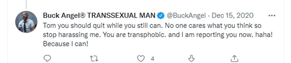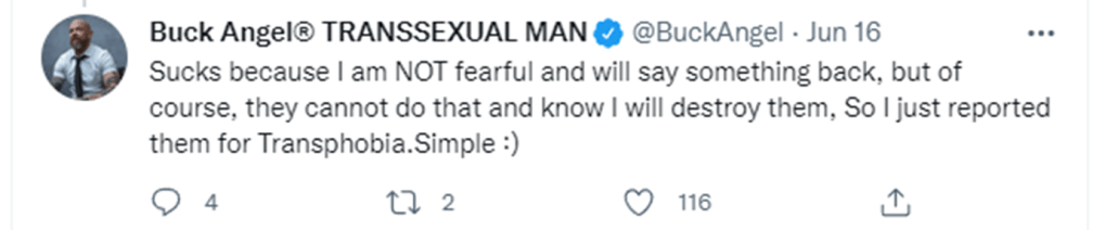 Buck Angel says she is a “human rights activist”. Children are humans, they have a right to be protected from pornography. They also need to be protected from harmful narratives that support gender ideology. Buck Angel has been a part of pushing that narrative for decades. Buck Angel also uses the protected status of being trans to her advantage to shut down views opposing her support of the trans narrative.