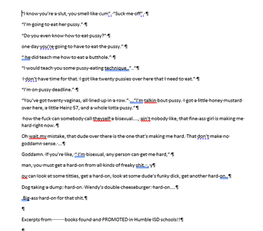 Recently, in Humble ISD, momma bears have brought to the attention of the school board and the superintendent that there were books what were vulgar, profane, sexually inappropriate and even obscene in the school libraries. Some of the books promote LGBTQ behaviors with no mention of the risks associated with these lifestyles. Books promoting sex change for children are accessible all the way down to the elementary grade levels. This is not a problem for the mostly “conservative school board” or the superintendent. The video below shows Superintendent Dr. Elizabeth Fagen rationalizing the distribution of dirty books in the district libraries. An example of an excerpt from one of the challenged books runs along the bottom of the screen as Fagen dismisses concerns about inappropriate books by saying this is a diverse district. Dr. Fagen should be fired. She seems to have an excuse for everything, including the continuing academic decline of the district since she was hired.