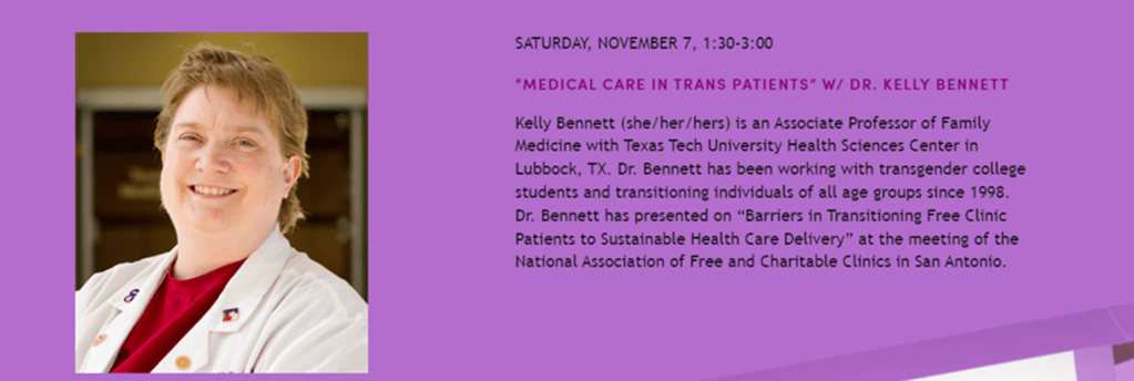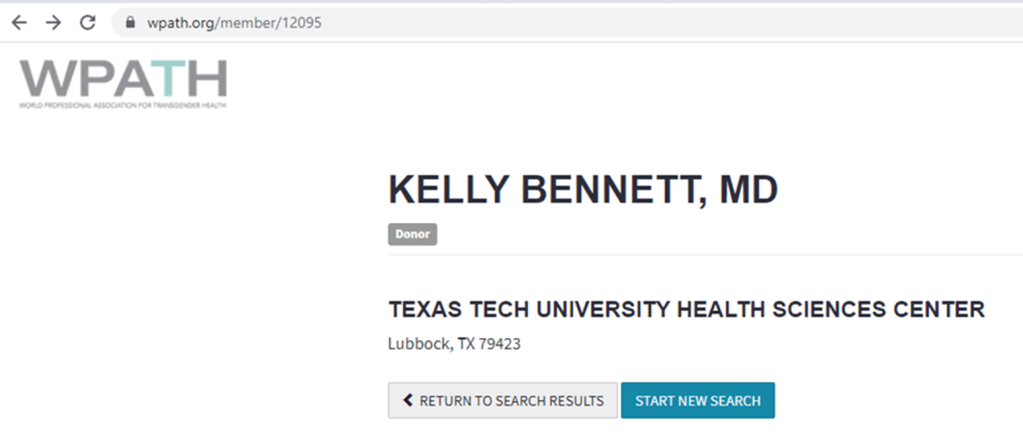 One of the doctors, Dr. Kelly Bennett (pronouns in bio) is seen below. She is a member of the World Professional Association of Transgender Health (WPATH), a biased advocacy group in which interested parties (mostly mental health providers and doctors making money off of trans medical abuse) advocate for increasingly lax standards for transgender health care. WPATH recently designated “eunuch” as a valid gender identity. WPATH recommends tucking and binding for youth. Any institution or doctor advancing WPATH diktat should be immediately relieved of their medical license and any government funding. Most of the organization leads identify as transgender or non-binary, it is not an unbiased organization and it seems to have disregarded any kind of medical ethics.