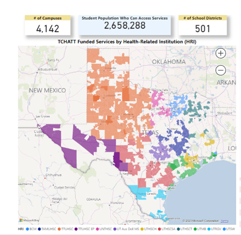 What is very concerning is the reach these institutions have into the schools where innocent children can be preyed upon by gender ideologists. The CMHCC published a tool detailing their reach. They are currently at 4,152 campuses in 501 school districts with 2,658,288 students who can access a provider through TCHATT.