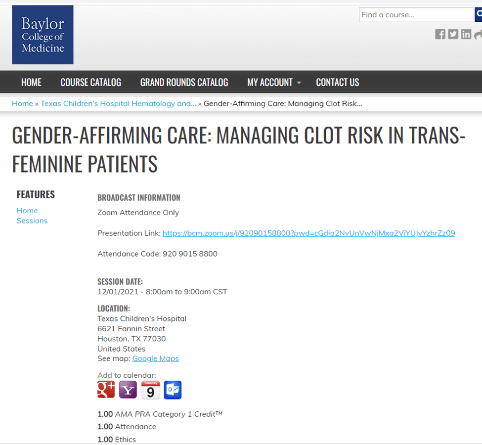 Texas Tech and UTSW also presented sessions on pediatric gender modification. The archived seminar pages can be found here and here. The Texas CMHCC took the pages and the seminar videos down after MassResistance Texas posted about them on Twitter. The doctor who presented for UTSW is an absolute quack. She participated in a “study” of pediatric gender care which included a sample size of just 16 participants (hardly a statistically valid sample) and of course the study found the response to treatment to be “favorable”.
