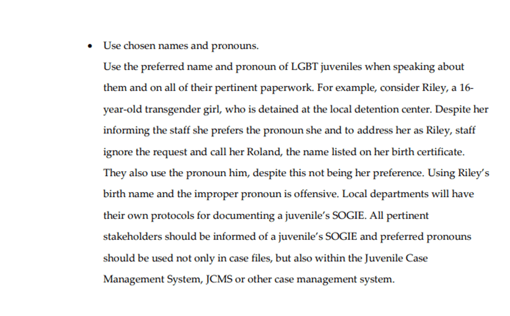 Employees are instructed to use the preferred pronouns and chosen names at all times, even when the juvenile is not present. All juvenile justice employees are prohibited from disclosing the child’s gender identity or sexual orientation to the parents or guardians.
