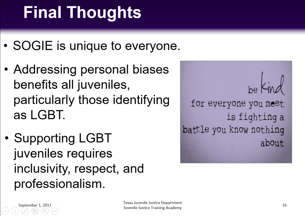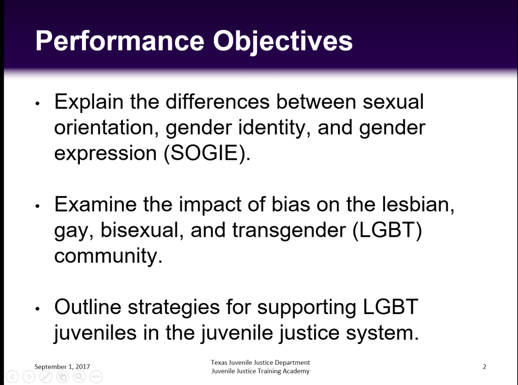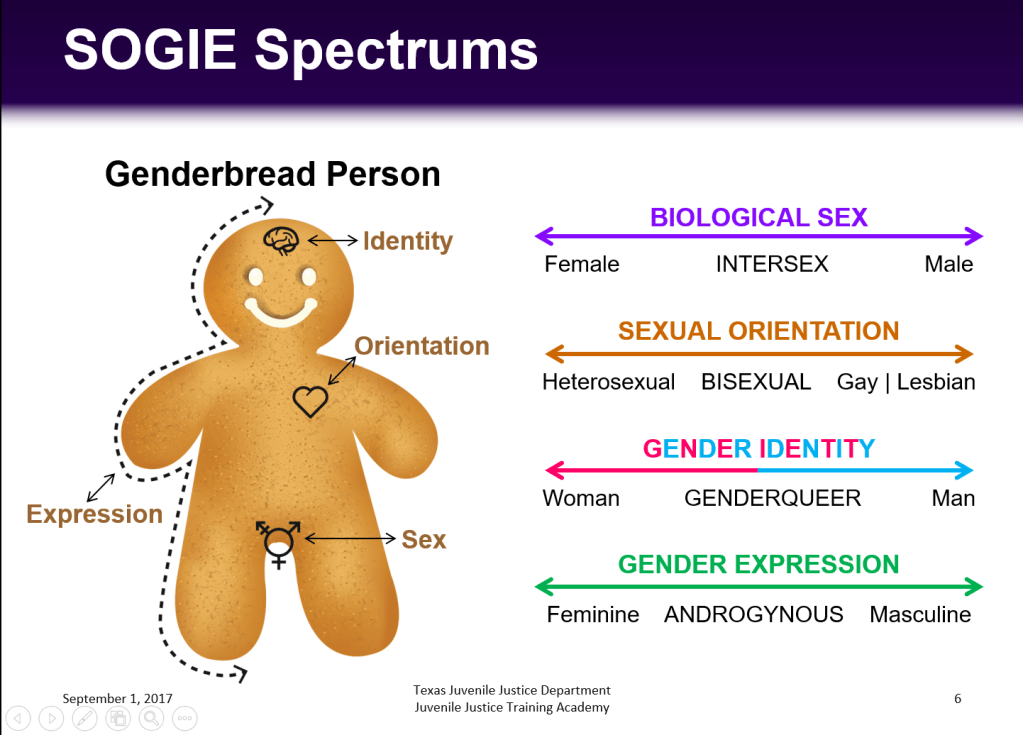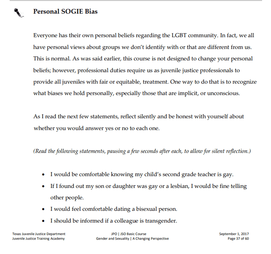 Supervision officers with the Texas Juvenile Justice Department were subjected to mandatory training in 2017 to explore how bias affects LGBTQ community in the justice system. The lesson plan was part of a “culture competency module” that is part of mandatory training under Texas Administrative Code Chapter 334. The training was extremely work even for 2023, but this training was approved in 2017. Employees were asked personal questions to help them explore their “implicit biases”, such as whether they would date a bisexual person, if they’d like their child’s second grade teacher to be gay, if they would be proud to tell their friends that their child was gay and if they feel they should be informed if a colleague is transgender.
